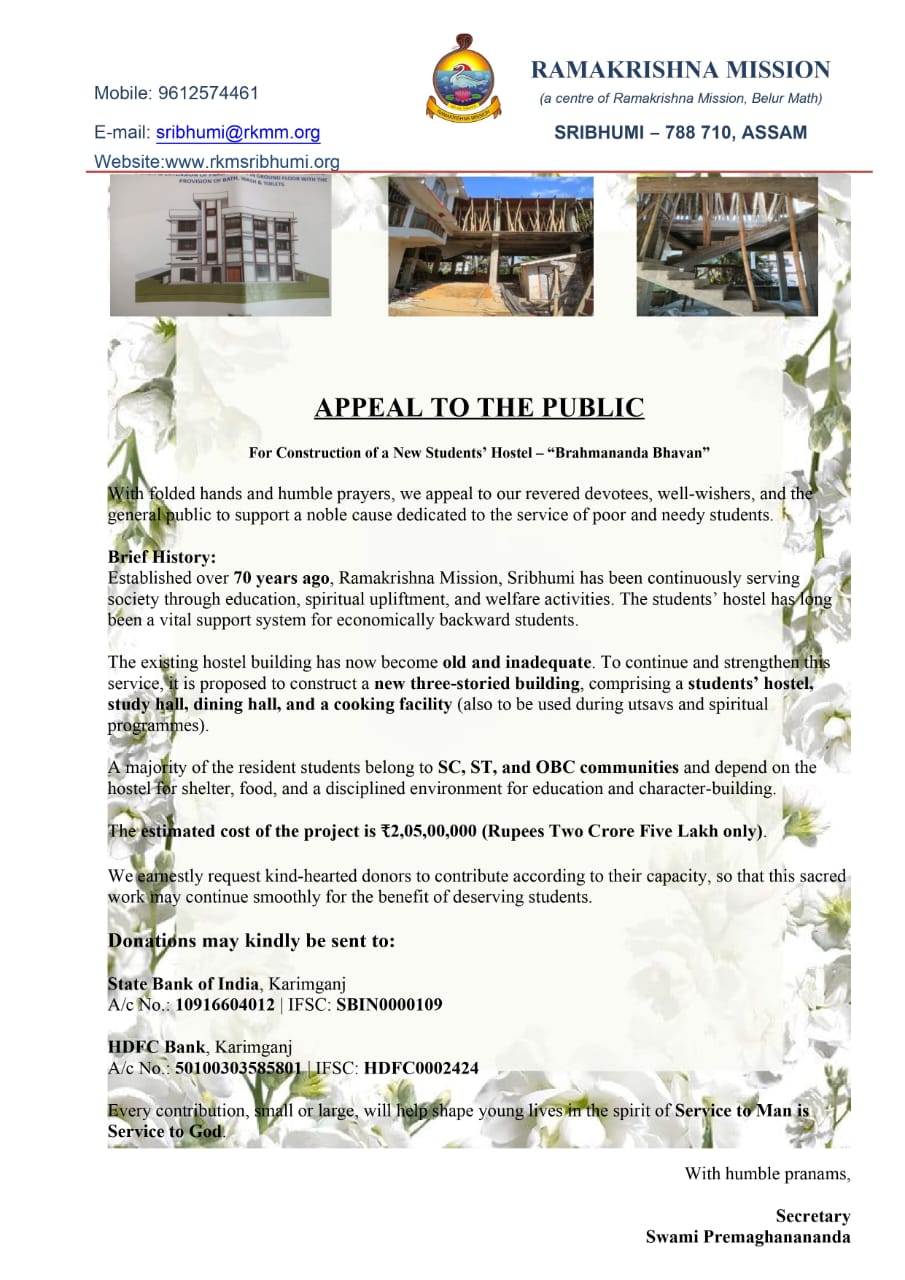 Established over 70 years ago, Ramakrishna Mission, Sribhumi has been continuously serving society through education, spiritual upliftment, and welfare activities. The students’ hostel has long been a vital support system for economically backward students.