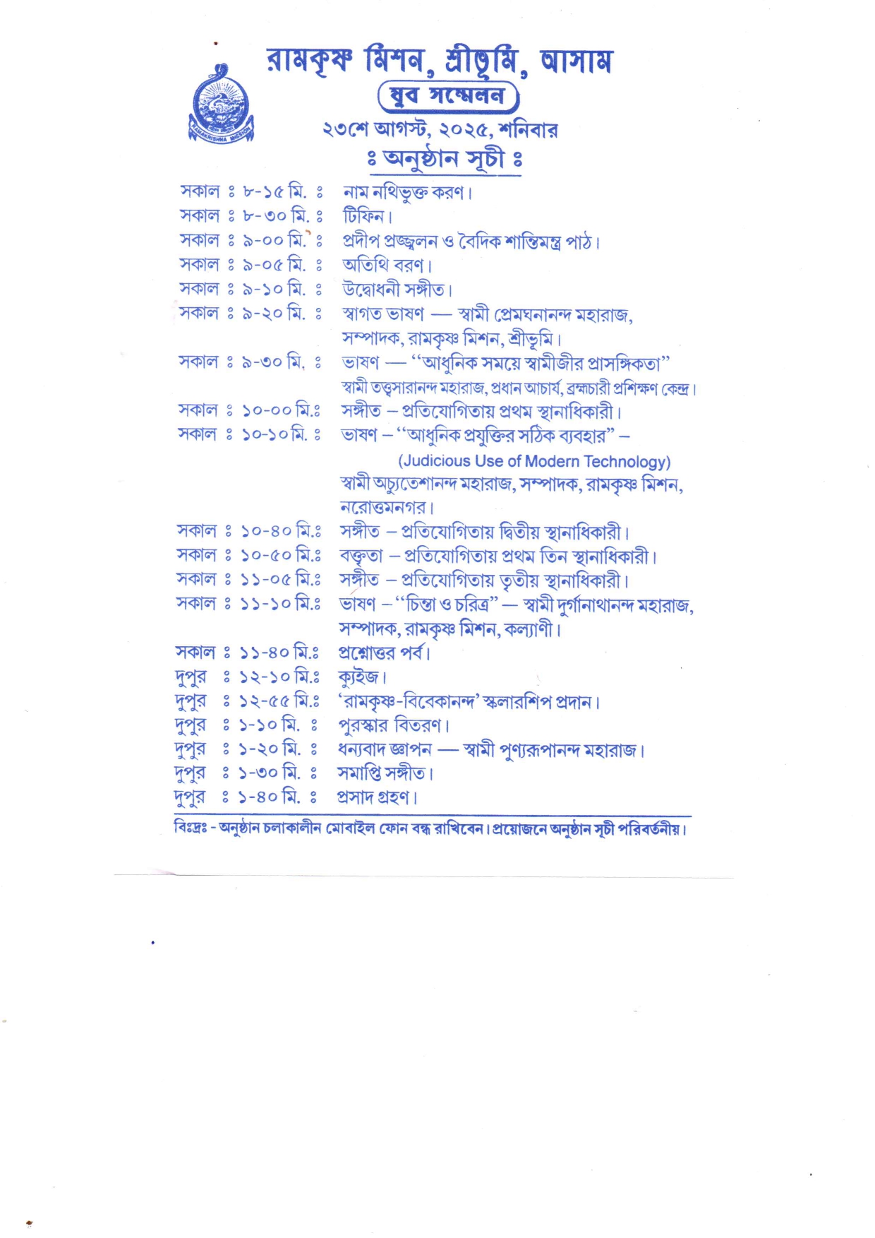 রামকৃষ্ণ মঠ ও মিশন শ্রীভূমির পরিচালনায়,আগামী ২৪শে আগস্ট ২০২৫, রবিবার,রামকৃষ্ণ মঠ শ্রীভূমিতে ভক্ত সম্মেলন অনুষ্ঠিত হবে।